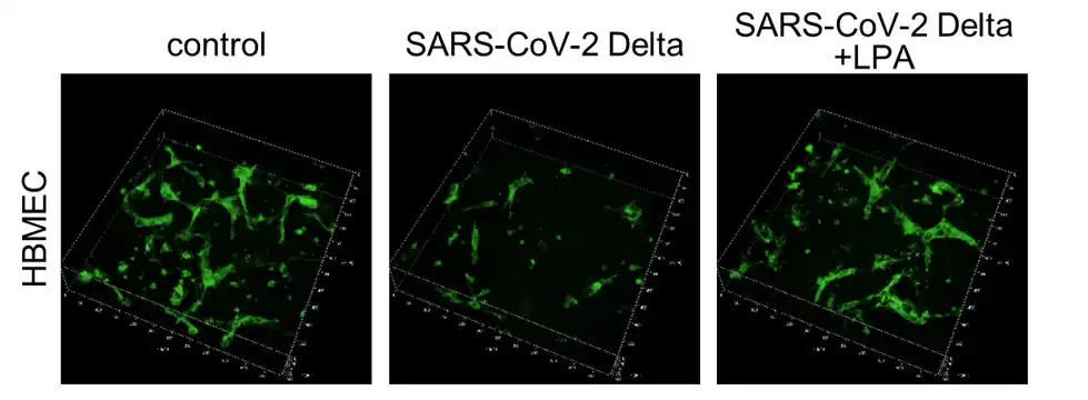 | 研究グループは、肺、脳、腎臓由来のヒト血管内皮細胞を用いて、生体内の血管構造を模倣した3次元培養システムを構築しました。このシステムでは、血管内皮細胞が管腔構造を形成し、LPA受容体(LPA4)やSARS-CoV-2侵入受容体(ACE2、TMPRSS2)が生体内と同様に発現することを確認しました。 | |||