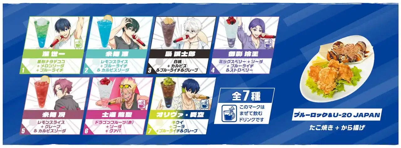 コラボメニューは、TVアニメ『ブルーロック』のキャラクターをイメージしたコラボドリンクを7種、コラボフードを1種ご用意します。 |