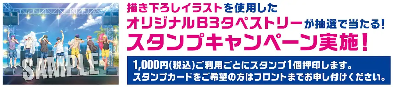 コラボメニューをご注文でお渡しするスタンプカードに、ご利用金額1,000円(税込)ごとにもらえるスタンプを5つ集めて応募すると、抽選で5名様に「オリジナルB3タペストリー」が当たる、スタンプキャンペーンも実施します。 |