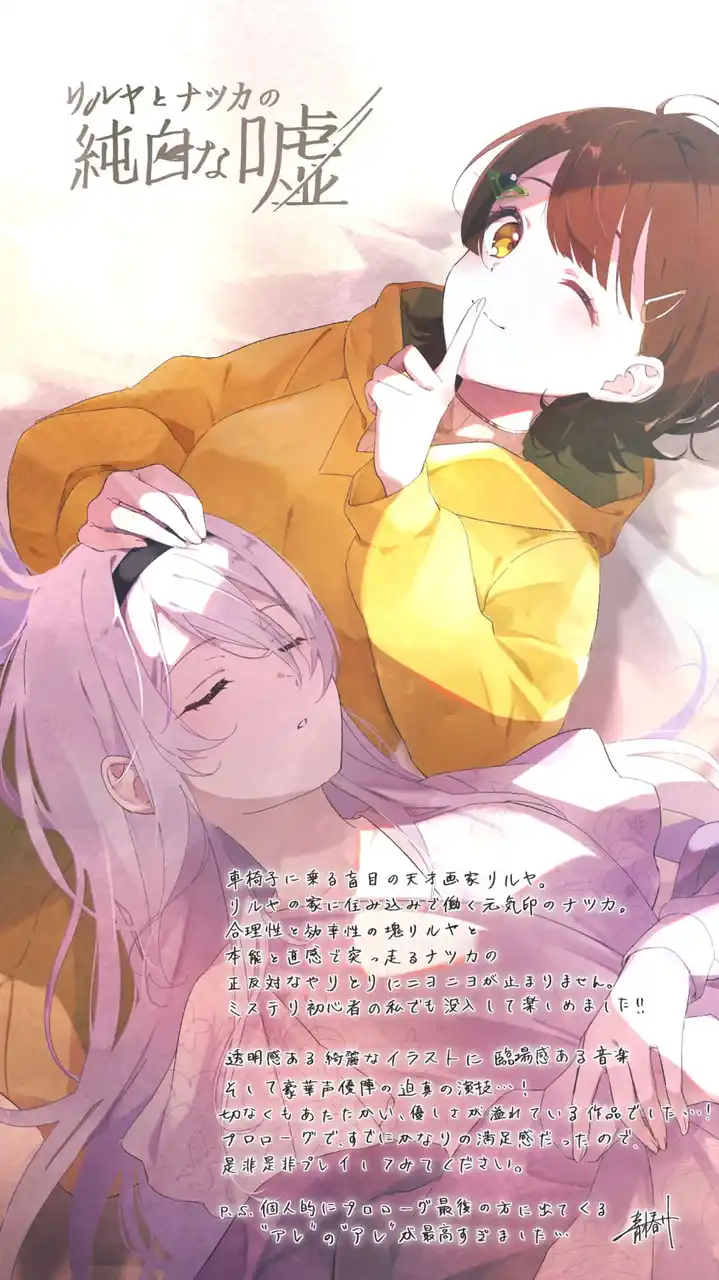 ントウイングラボ(本社:東京都千代田区 代表取締役社長:山川竜一郎、以下、フロントウイングラボ)は、ビジュアルノベルゲーム『リルヤとナツカの純白な嘘』が発売1周年を迎えたことを記念し、殺伐百合アンソロジー主宰「れむれむ」、百合小説家「綾加奈」からのレビューコメントが到着したことを発表いたします。 |