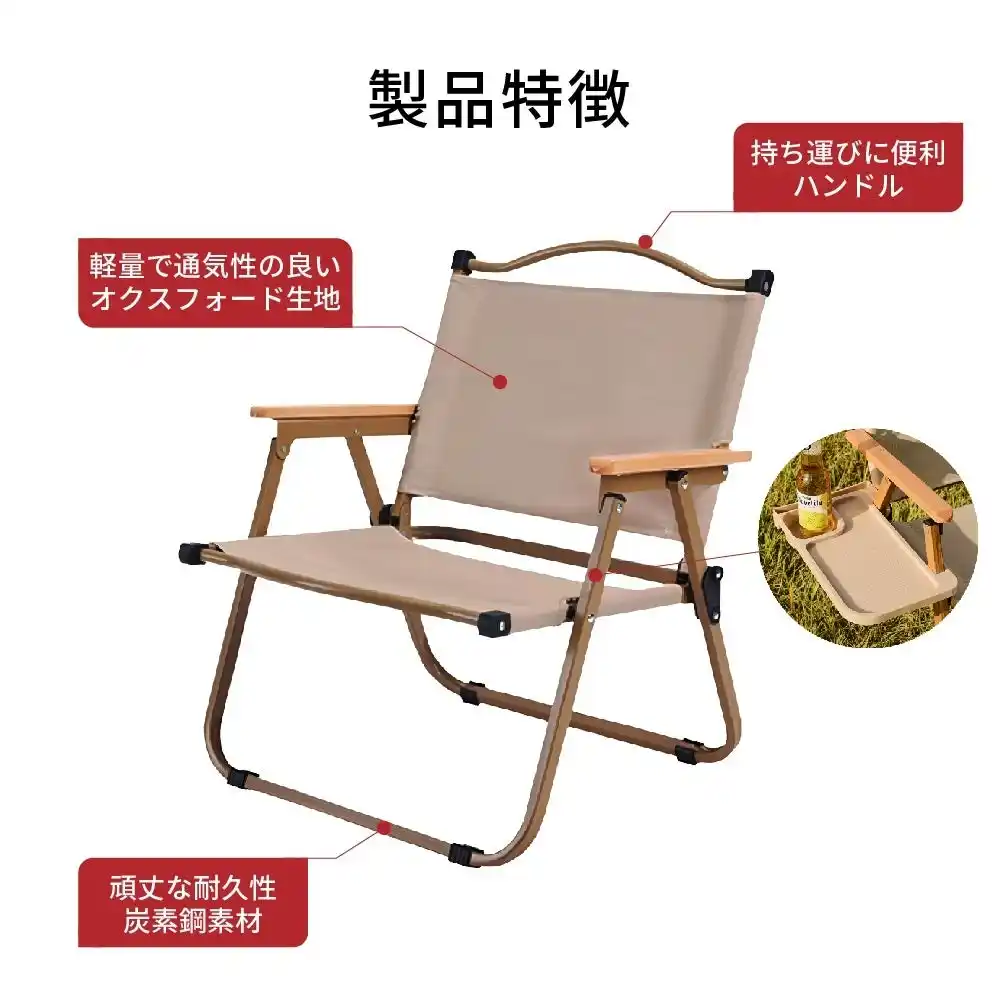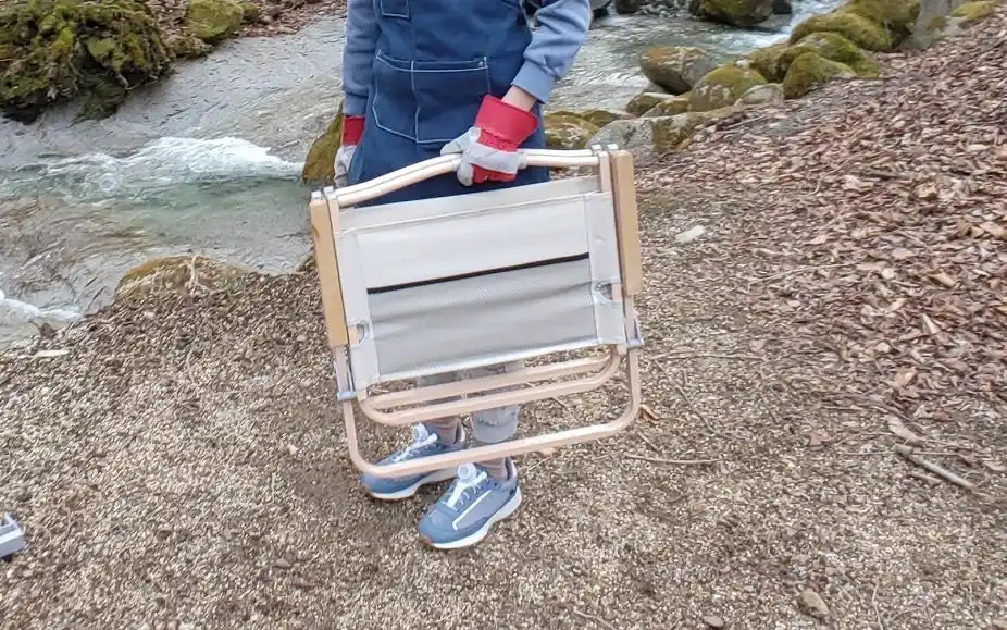シートの生地は雨に濡れたとしてもすぐに乾くポリエステルで、ひじ掛けには天然木を使用。重量は軽量だけど強風で飛ばされるリスクはしっかり低減できる2.8kg。力を入れずに、ハンドル部分を開くだけで使用できるから、小さなお子さん連れのキャンパーにも大人気です。 |