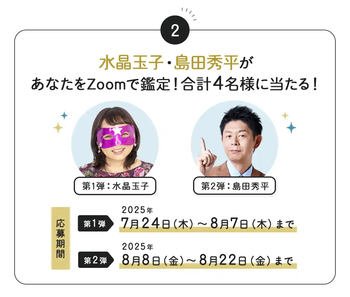 人気占い師・水晶玉子氏と島田秀平氏が、あなたを直接Zoomで鑑定します。抽選で合計4名様に当たる特別なチャンスです。 |