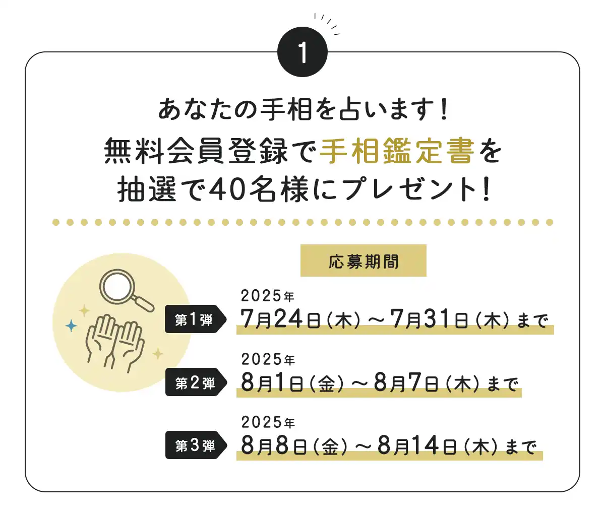 あなたの手相の写真から「性質や健康」「恋愛傾向」「仕事やお金」のいずれかを占う、手相鑑定書が抽選で40名様に当たります。LINE連携をしていただくと当選確率がアップいたします。 |