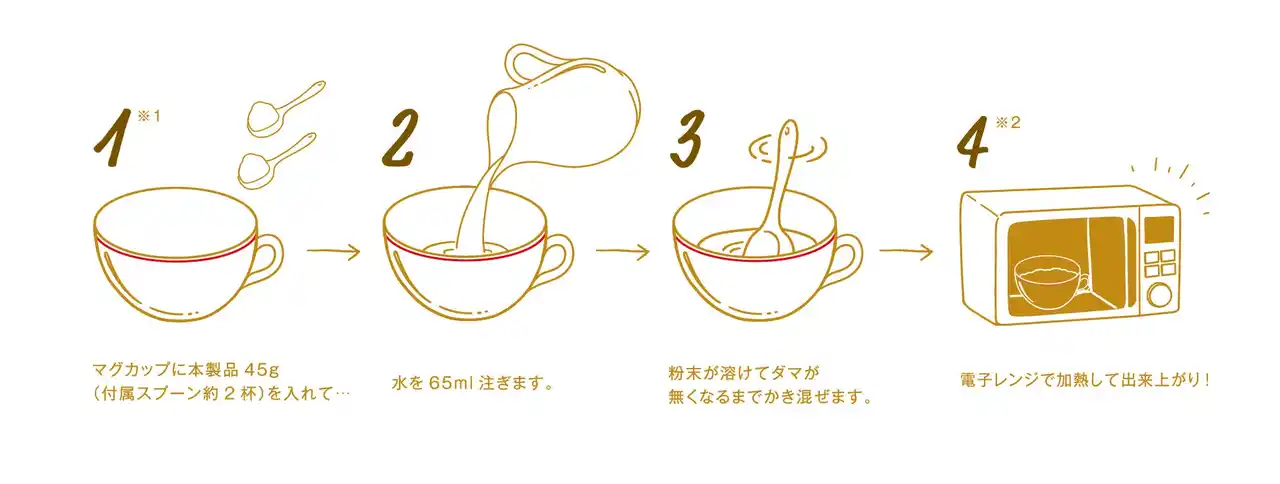 調理はとてもシンプル!製品付属のスプーンで粉末を約2杯分マグカップに入れ、さらに水 65 ml を混ぜて電子レンジで加熱するだけ。たった2分程度で、しっとりふわふわ食感の焼き立て風ケーキが完成します。 |