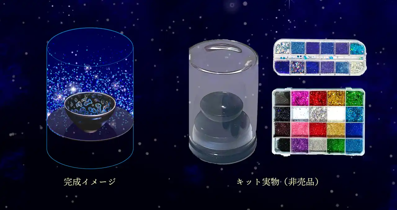 曜変天目茶碗の実際の展示ケースをイメージした容器に自由にラメを入れ、自分だけのスノードームを作ります。 |