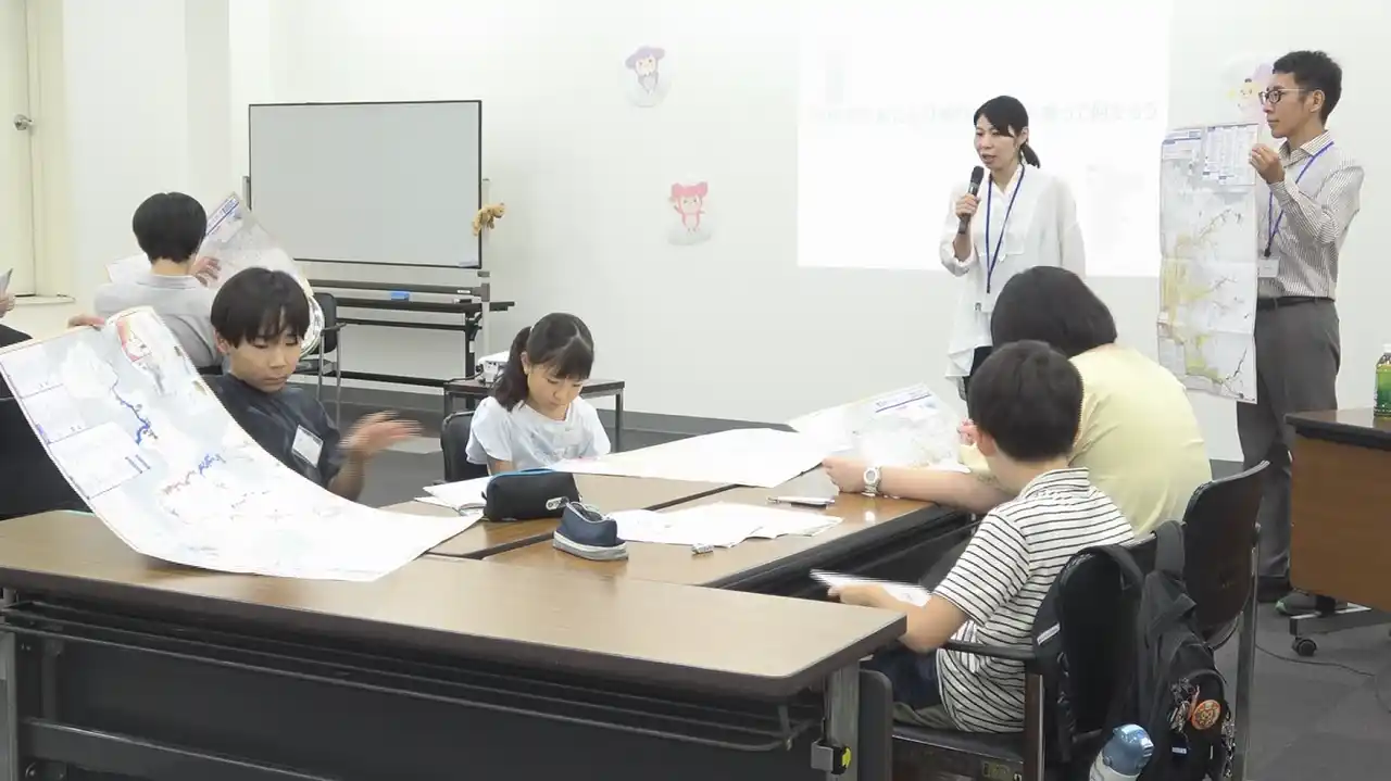 初日に参加した子どもは15人。4つのグループに分かれ、座学やグループワークに参加しました。座学では、奈良市危機管理課職員から災害の種類やハザードマップの見方等、防災についての基礎知識を学び、グループワークでは、サポート役の大学生とともに災害や防災についての意見を書き出し、意見交換を行いました。子どもたちは真剣な様子で熱心に取り組んでいました。 |