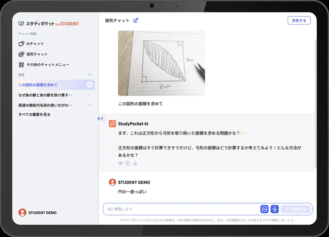 ※すぐには答えを教えない「探究チャット」など、学習場面で活用できる機能を搭載。 |