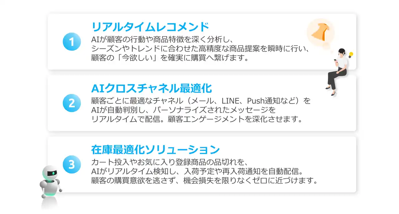 AIを活用したプレディクティブパーソナライゼーションの導入により、売上/LTV向上、在庫最適化、顧客エンゲージメント強化を実現します。また、顧客行動に基づくコーディネート提案や複数ブランドの統合マーケティング支援など、アパレル特有の多様なニーズにも対応可能です。 |