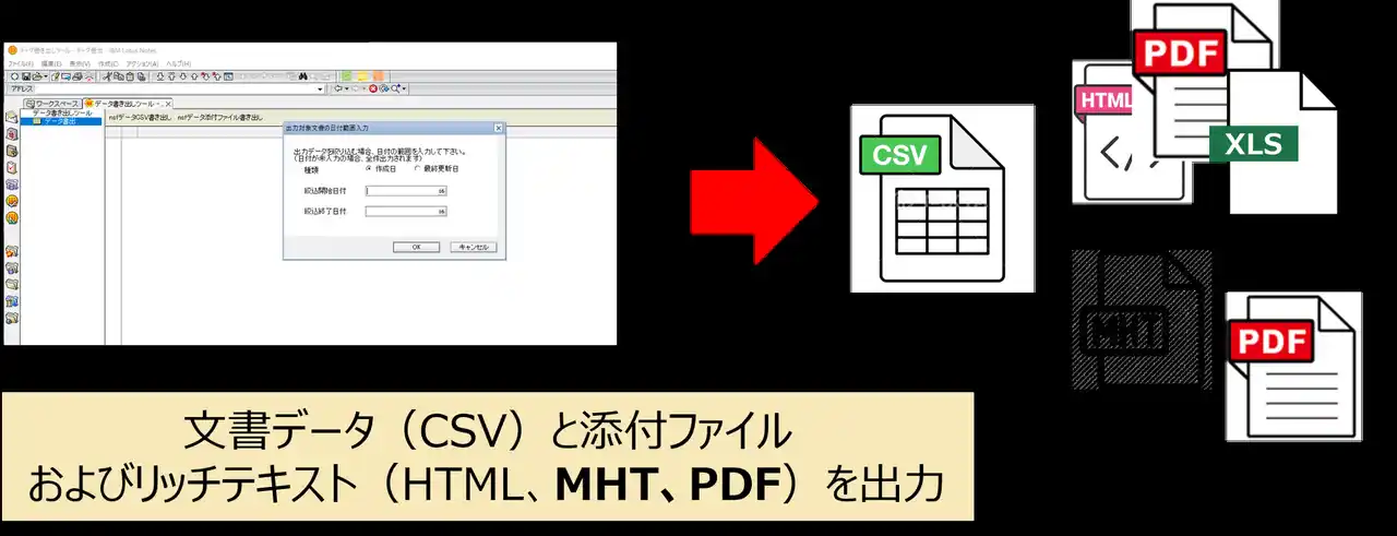 Ver2.1】を2025年7月28日(月)より提供します。「Notes文書データ抽出ツール」を利用することで、「移行先のプラットフォームが決まっていないNotesデータベースの文書データや添付ファイルをどこかに退避したい」といったご要望への対応が可能となります。また、Notesの文書データをcsv形式で出力することによって、移行先のプラットフォームが確定した際に、新たなプラットフォームにデータを取り込んで文書データの再利用が可能となります。今回のVer2.1へのバージョンアップにより、PDF・MHT形式でのリッチテキスト出力、文書単位でのCSV書き出し、出力フィールドの絞り込み、ライセンス管理が可能となります。 |
