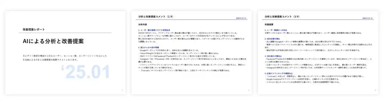 生成AIが、GA4の「ユーザー数」「セッション数」「エンゲージメント」を主とした数値データを分析し、Webサイトの現状の課題とその改善策を「概要」として数ページにわたるテキストで提案します。 |