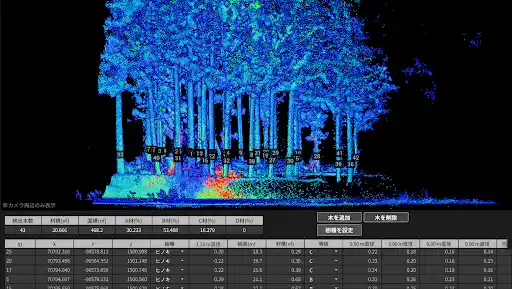 山林の計測時に自動的に胸高直径、本数、樹高の解析が可能(立木補償の概算) |