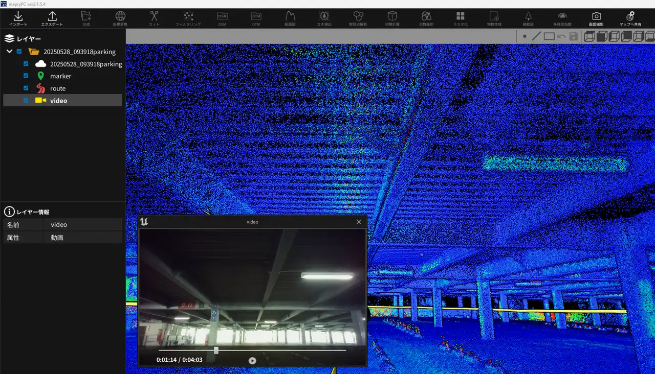 LA03-1で取得した点群と動画(動画を動かすと点群データも動く。クリックで寸法計測が可能) |