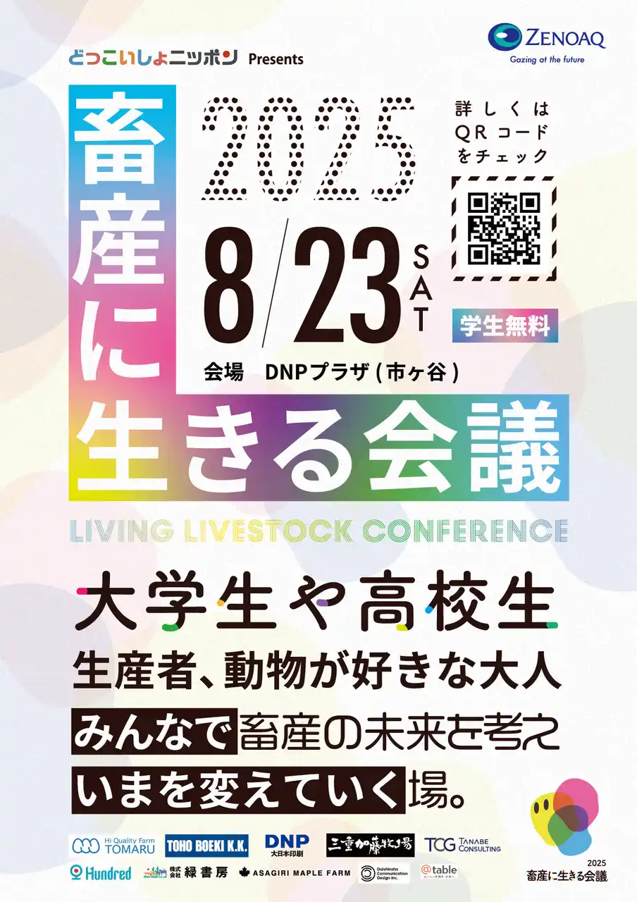 | 動物用医薬品メーカーの日本全薬工業株式会社(ゼノアック)が運営するメディア「どっこいしょニッポン」は、2025年8月23日(土)にDNPプラザ(東京・市ケ谷)にて、畜産業界の未来を考えるキャリアイベント「畜産に生きる会議」を開催します。これまで農業高校・大学など延べ56校、339名以上が参加した「農高アカデミー」を拡大した本イベントでは、第一線で活躍する生産者や、富士通、DNPといった異業種企業の社会人が登壇。学生(参加無料)は、AIを活用したワークショップやリアルなトークセッションを通じて、業界の多様なキャリアパスと未来を考えます。 | ||||||||||||||