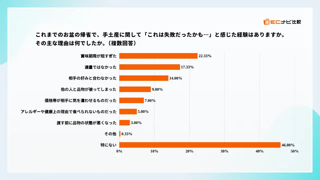 手土産に関する失敗経験について聞いたところ、半数近くの46.0%が「特にない」と回答しました。失敗経験がある人の中では、その理由として「賞味期限が短すぎた」(22.3%)が最も多く、次いで「適量ではなかった」(17.3%)、「相手の好みと合わなかった」(14.0%)と続きました。 |