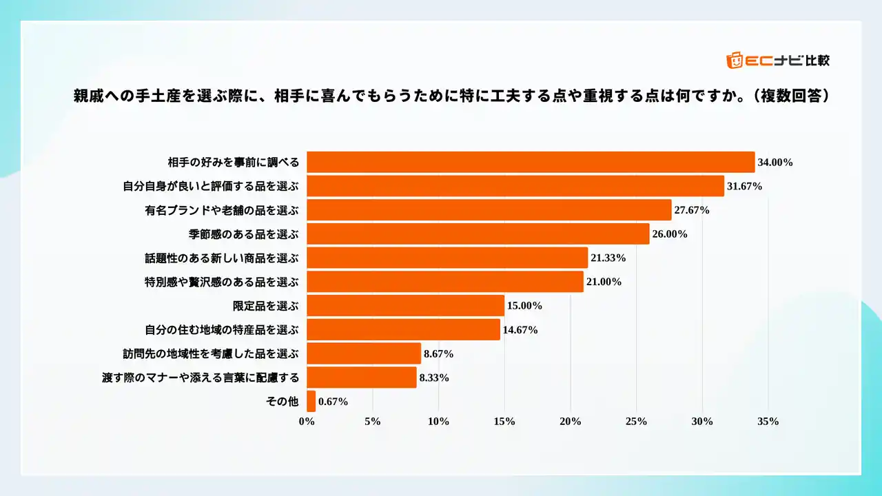 手土産で喜んでもらうための工夫や重視する点について聞いたところ、最も多かったのは「相手の好みを事前に調べる」(34.0%)でした。次いで「自分自身が良いと評価する品を選ぶ」(31.7%)、「有名ブランドや老舗の品を選ぶ」(27.7%)と続き、相手へのリサーチを基本としつつも、贈り手自身のセンスやブランドへの信頼も選択の決め手となっていることがうかがえます。 |