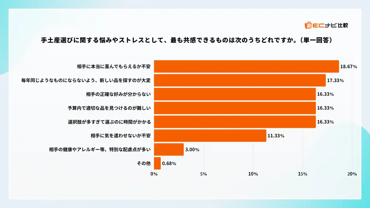 ・手土産選びの最大のストレスは、「相手に本当に喜んでもらえるか不安」(18.7%) |