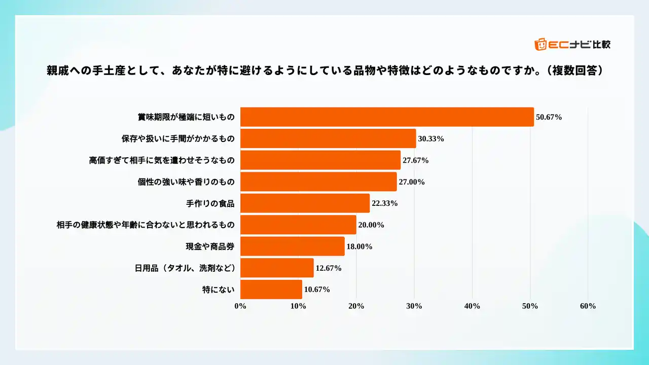 親戚への手土産として特に避けているものを聞いたところ、「賞味期限が極端に短いもの」が50.7%と過半数を占め、明確に避けられていることがわかりました。次いで「保存や扱いに手間がかかるもの」(30.3%)、「高価すぎて相手に気を遣わせそうなもの」(27.7%)が続き、相手に余計な負担や気遣いをさせないという配慮が強く働いていることがうかがえます。 |