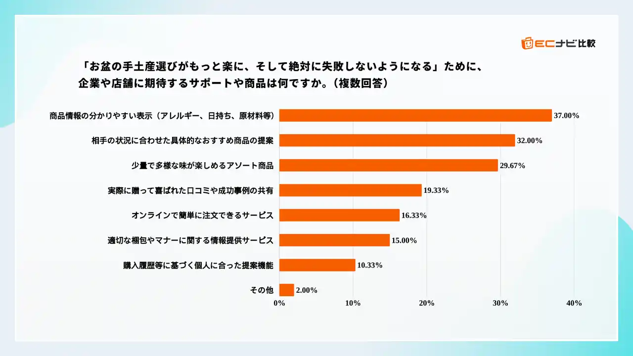 手土産選びを楽にするために企業や店舗に期待するサポートを聞いたところ、最も多かったのは「商品情報の分かりやすい表示(アレルギー、日持ち、原材料等)」(37.0%)でした。次いで「相手の状況に合わせた具体的なおすすめ商品の提案」(32.0%)、「少量で多様な味が楽しめるアソート商品」(29.7%)が続き、基本的な情報の透明性と、パーソナライズされた提案力が求められていることがわかりました。 |
