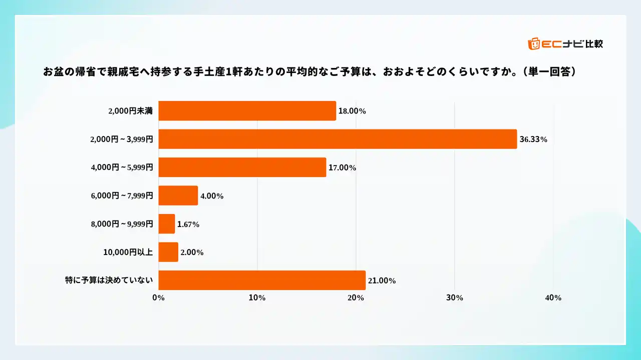 お盆は、多くの人々が故郷へ帰り、家族や親戚と再会する大切な時期です。その際に欠かせないのが、日頃の感謝を伝える「手土産」。しかし、毎年恒例の行事だからこそ、「何を選べば良いか分からない」「マンネリになっていないか不安」といった悩みを抱える人も少なくありません。そこで「ECナビ比較」は、お盆の手土産選びの予算や重視するポイント、そして隠れた悩みや失敗談まで、消費者のリアルな実態を調査しました。本調査が、心に残る手土産選びの一助となることを目指します。 |