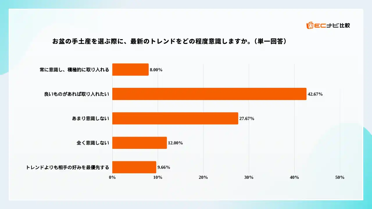 手土産選びで最新のトレンドをどの程度意識するか聞いたところ、「良いものがあれば取り入れたい」が42.7%で最多でした。一方で、「あまり意識しない」(27.7%)と「全く意識しない」(12.0%)を合わせると約4割にのぼり、トレンドを積極的に追うよりも、定番や相手の好みを優先する堅実な姿勢が見て取れます。 |