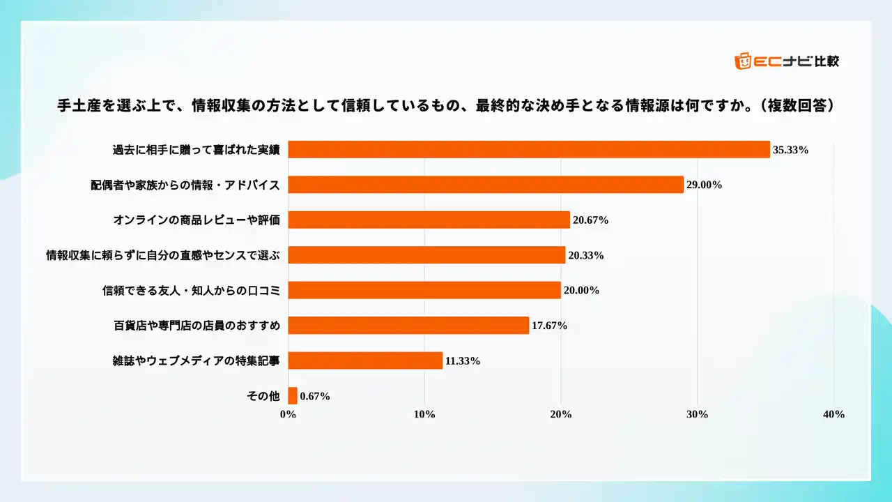 ・手土産選びで最も信頼する情報源は、「過去に相手に贈って喜ばれた実績」(35.3%) |