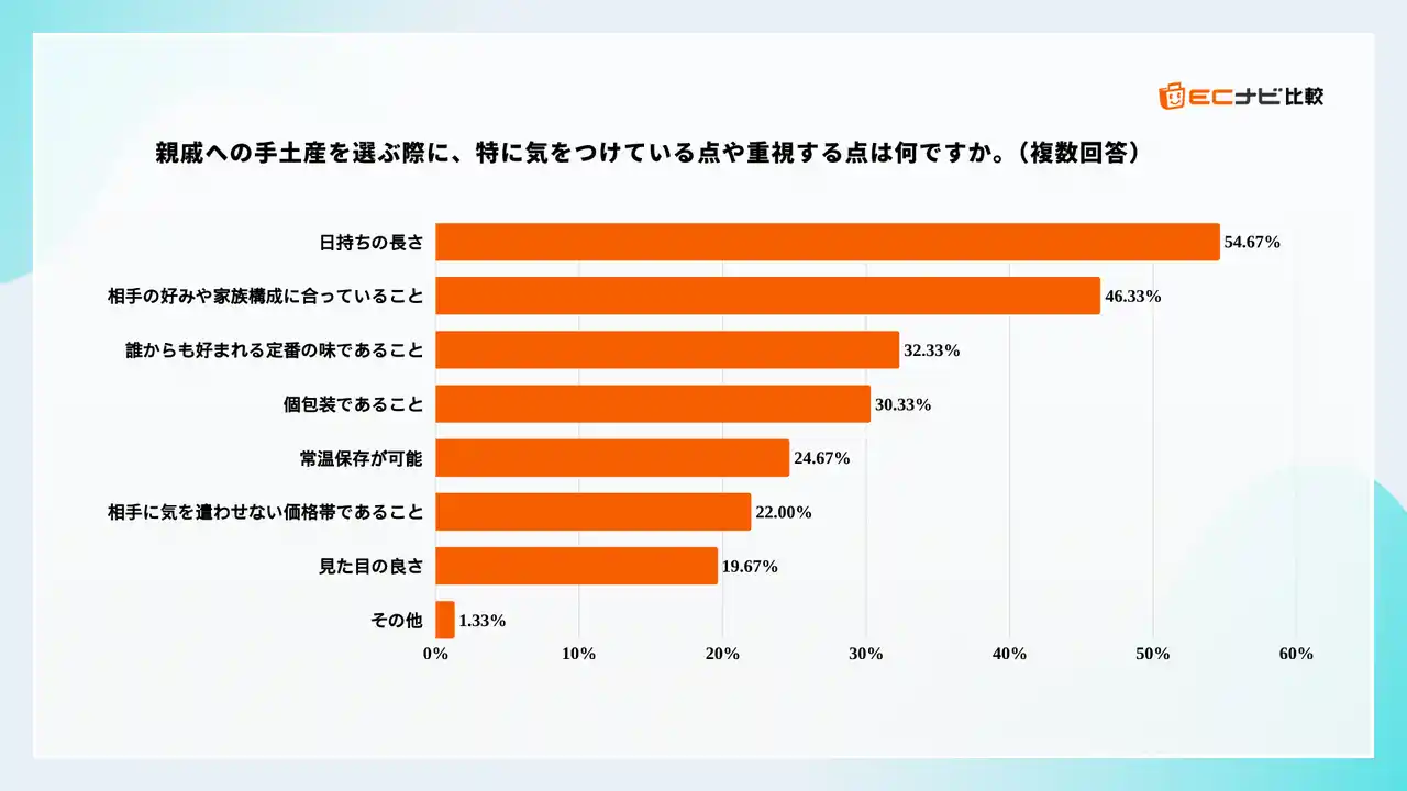 親戚への手土産を選ぶ際に特に気をつけている点について聞いたところ、「日持ちの長さ」が54.7%で過半数を占め、最も重視されていることがわかりました。次いで「相手の好みや家族構成に合っていること」(46.3%)となっており、相手に負担をかけない実用的な配慮と、相手を思うパーソナルな心遣いの両方が大切にされているようです。 |