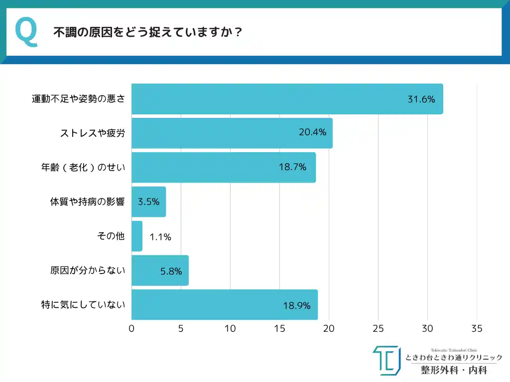 | 最も多かったのは「運動不足や姿勢の悪さ(31.6%)」、続いて「ストレスや疲労(20.4%)」、「老化(18.7%)」という結果に。一定数が「特に気にしていない(18.9%)」「原因がわからない(5.8%)」と回答しており、自分の不調の背景を正しく理解できていない層も多いことが分かります。加齢要因だけでなく、生活習慣や精神的ストレスが複合的に関わっている可能性があるにもかかわらず、「仕方がない」と放置してしまうリスクが指摘されます。 | |||||||||||||||