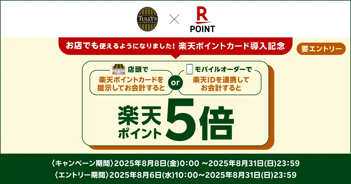 本導入を記念して、2025年8月8日(金)から8月31日(日)まで、「タリーズコーヒー 楽天ポイントカードサービス開始記念!ポイント5倍キャンペーン!」を実施します。 |