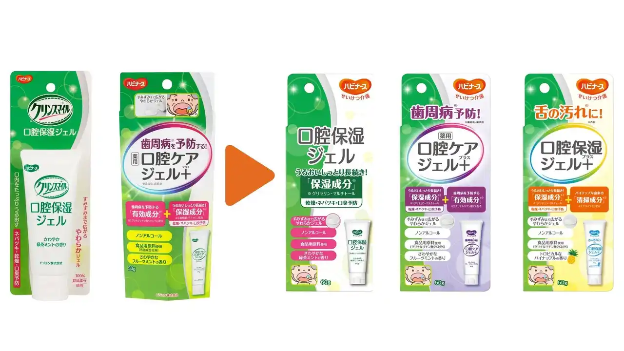 現在販売中の口腔ケアシリーズ2商品「口腔保湿ジェル」と「歯周病予防 薬用口腔ケアジェルプラス」(医薬部外品)も、介護ブランド「ハビナース」の想いを体現したデザインへと、パッケージ |