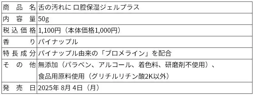この度発売する「舌の汚れに 口腔保湿ジェルプラス」は、口腔内の保湿を重視して開発した「口腔保湿ジェル」(2016年発売)の特長はそのままに、タンパク質を分解するパイナップル由来の清掃成分「ブロメライン」を新たに配合した商品で、口腔内の保湿と舌のケアの両立を目指した配合設計。アルコールや着色料など無添加で、高齢者でも安心して利用できる、すみずみまでひろがるやわらかジェルです。トロピカルなパイナップルの香りで楽しみながらお使いいただけます。 |