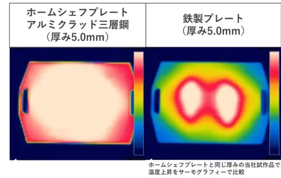 熱伝導が良いアルミを、丈夫でさびにくいステンレスで挟んだ「アルミクラッド三層鋼」の構造で、プレート全体の温度が均一に上昇し、大きなお肉もムラなく焼き上げます。また、食材を置いてもプレートの温度が下がりにくく、旨味を閉じ込めてジューシーに仕上げることができます。 |