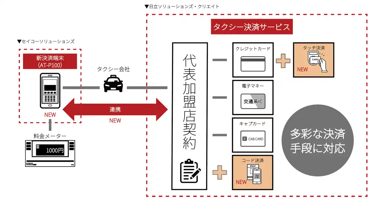 株式会社日立ソリューションズ・クリエイト(本社:東京都品川区、取締役社長:南 章一、以下、日立ソリューションズ・クリエイト)は、セイコーソリューションズ株式会社(本社:千葉県千葉市、代表取締役社長:関根 淳、以下、セイコーソリューションズ)製の新タクシーメーター連動決済端末「CREPiCO(クレピコ)AT-P100」(以下、「AT-P100」)と日立ソリューションズ・クリエイトのタクシー業界向け決済サービス「タクシー決済サービス」(以下、本サービス)の新たな連携を開始します。 | ||||||