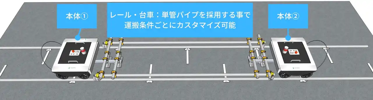 長距離・悪路も安定走行: 独自開発のパイプレール上を走行するため、ぬかるみや凹凸のある不整地でも安定した長距離運搬を実現します。 |