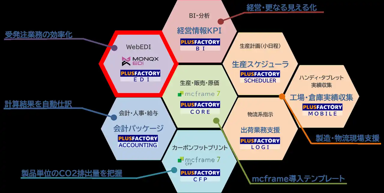 コベルコシステム株式会社が提供する「PLUSFACTORY」は、ビジネスエンジニアリング株式会社(B- EN-G)が開発した純国産の製造業向け基幹業務パッケージ"mcframe"をコアに、製造業向け適材適所型ERP構築ソリューションを提供しています。複雑化する製造業の多様なニーズに対応するために、今回、YEデジタル Kyushuが提供する「MONQX EDI」が、「PLUSFACTORY」シリーズに加わり、「PLUSFACTORY EDI」として受発注業務の効率化を支援するサービスとして採用されました。 |