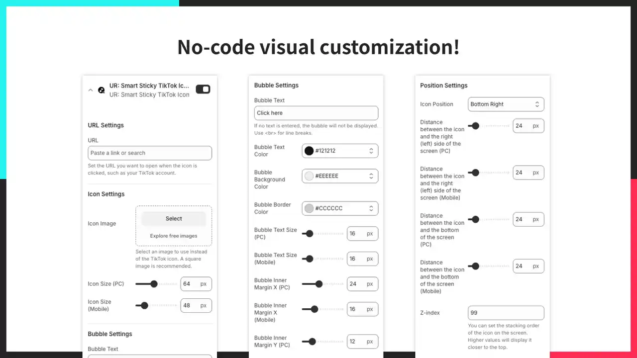 「UR: Smart Sticky TikTok Icon」は、ShopifyストアにTikTokへの誘導アイコンを追従表示できる日本製アプリです。画面スクロールしても常に表示される固定型アイコンにより、訪問者を効果的にTikTokアカウントへ誘導。アイコン画像やリンク先URL、表示位置、サイズなどを管理画面から簡単にカスタマイズ可能。コーディング知識不要で、インストール後すぐに利用開始できます。SNSマーケティングの強化とTikTokフォロワー増加を同時に実現する、費用対効果の高いマーケティングツールです。 |