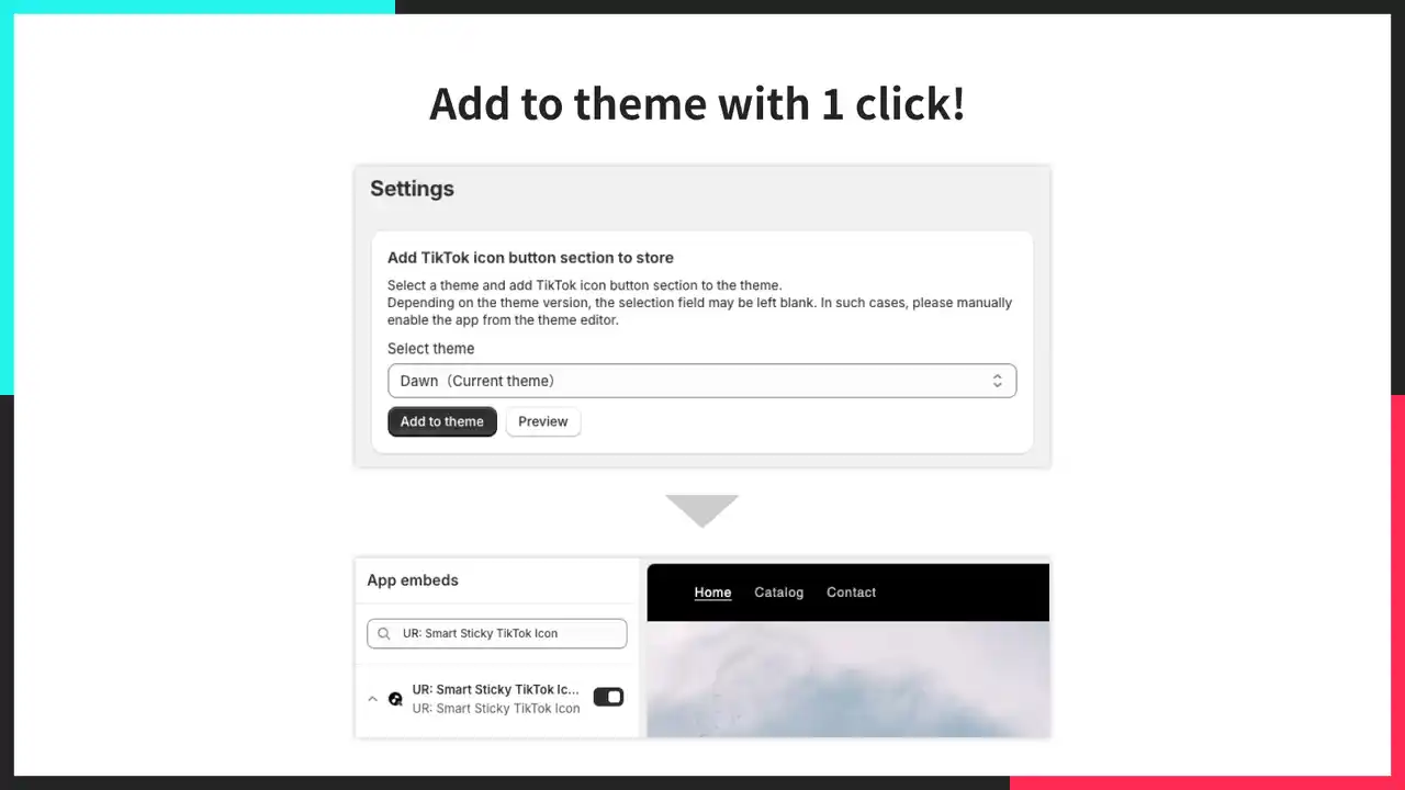 アプリをインストール後、1クリックでストアへのTikTokアイコンアプリブロックを追加できます。難しいコードの編集作業は一切必要ありません。アプリ管理画面から使用中のテーマを選択し、「テーマに追加」ボタンをクリックするだけで自動的にアプリブロックが組み込まれます。これにより、技術的なハードルなく、すぐにTikTok誘導機能をストアに実装できます。 |