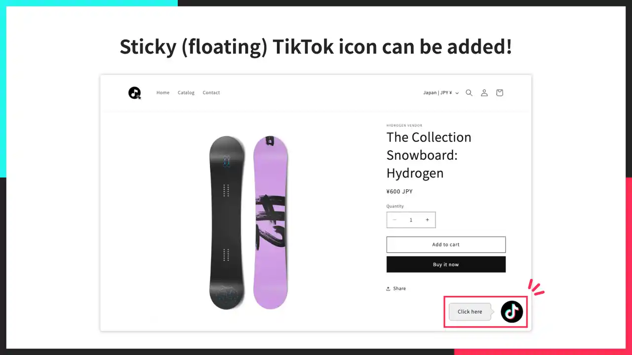 「UR: Smart Sticky TikTok Icon」は「シンプルTikTok誘導|お手軽追従TikTokアイコン」の海外向け Shopify アプリで、以下のようにストア内のあらゆるページに追従型のTikTokアイコンを設置できるアプリです。シンプルで使いやすい設計により、技術的な知識がない方でも簡単に導入・運用が可能です。 |