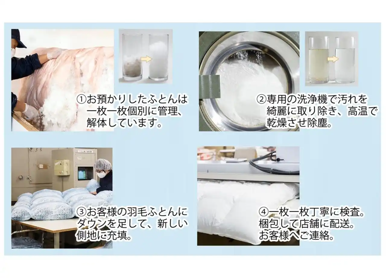| 羽毛ふとんリフォームの工程は、1.羽毛ふとんを解体 2.取り出した羽毛の洗浄・除塵・乾燥 3.足し羽毛 4.新しい側地へ充填、最後に異物の混入などがないか確認して出荷します。作業に際しては、ほかの顧客のふとんと混在しないよう、徹底した個別管理の下でお客様の羽毛ふとんを1枚1枚加工いたします。 | |||