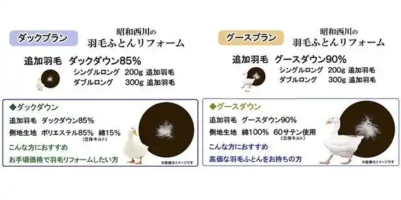 | 2025年はお買い求めやすい【ダックプラン】と高価な羽毛ふとんのお客様におすすめする【グースプラン】をご用意しております。 | |||