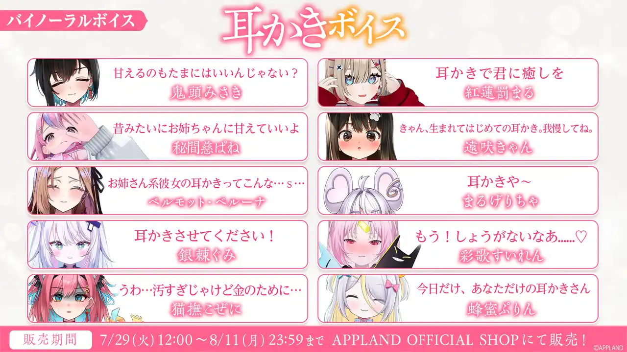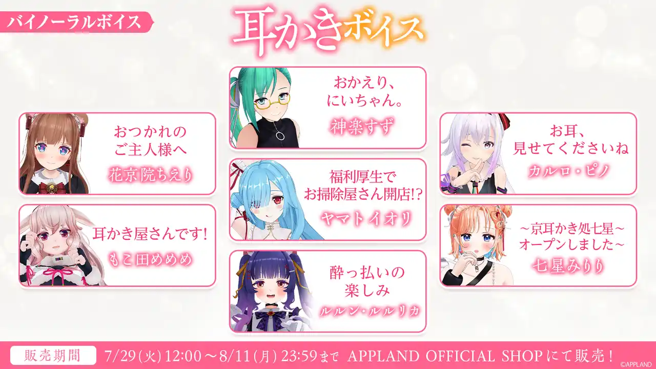 アップランド所属「.LIVE」・「ぶいぱい」メンバーによるバイノーラルボイスを2025年7月29日(火)より販売いたします!『癒しの時間をあなたの耳元にお届け』をテーマに、.LIVEメンバーとぶいぱいメンバーそれぞれが考案した、耳かきに関するシチュエーションが楽しめるボイスコンテンツです。是非お楽しみください! |