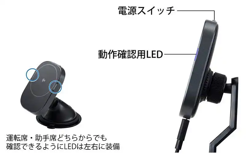 運転席、助手席側からでも充電状況が分かるように、ホルダーの左右に2つのLEDを搭載しています。 |