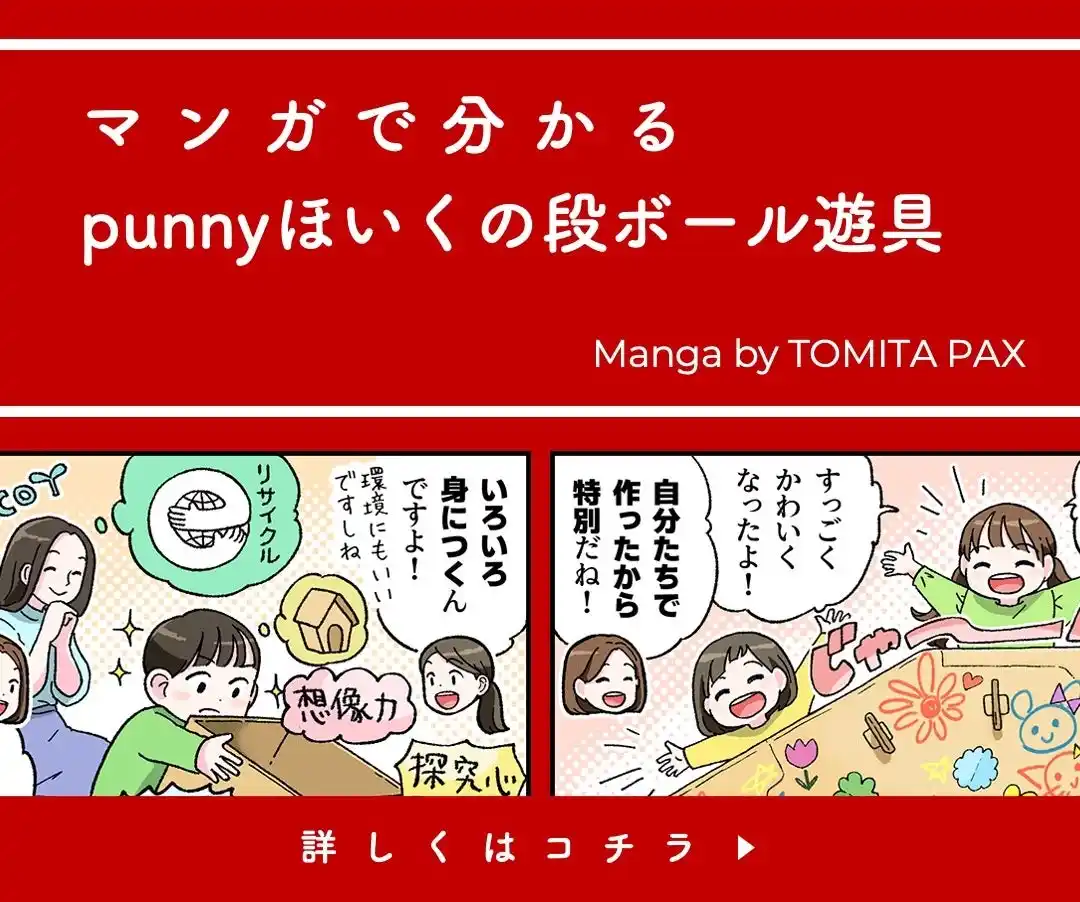 | 「punnyほいく」のダンボール製品は、実際に保育園・幼稚園で使用していただき保育士さんの意見をもとに開発・改良を行なっています。素材は身近なダンボールを使用し親子で楽しめる遊具や便利なグッズで健やかな子育てを応援します。 | |||||||||