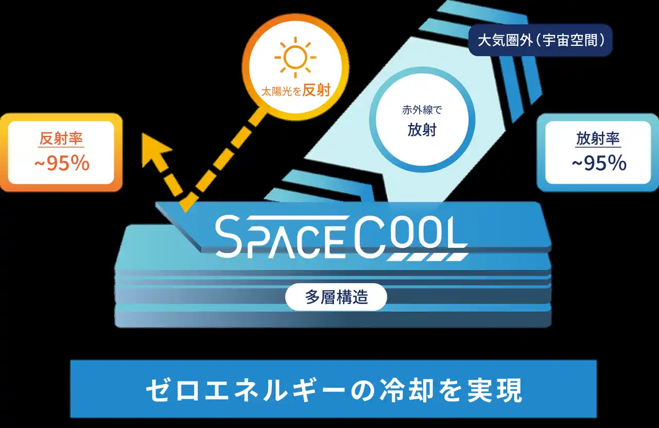 直射日光下において、太陽光からの熱をブロックし熱吸収を抑えるだけでなく、熱を「大気の窓⁽*⁾」の波長域の赤外線として宇宙に逃がすことで、ゼロエネルギーで外気温よりも温度低下することを可能にした世界最高レベルの放射冷却性能を持つ新素材です。 |