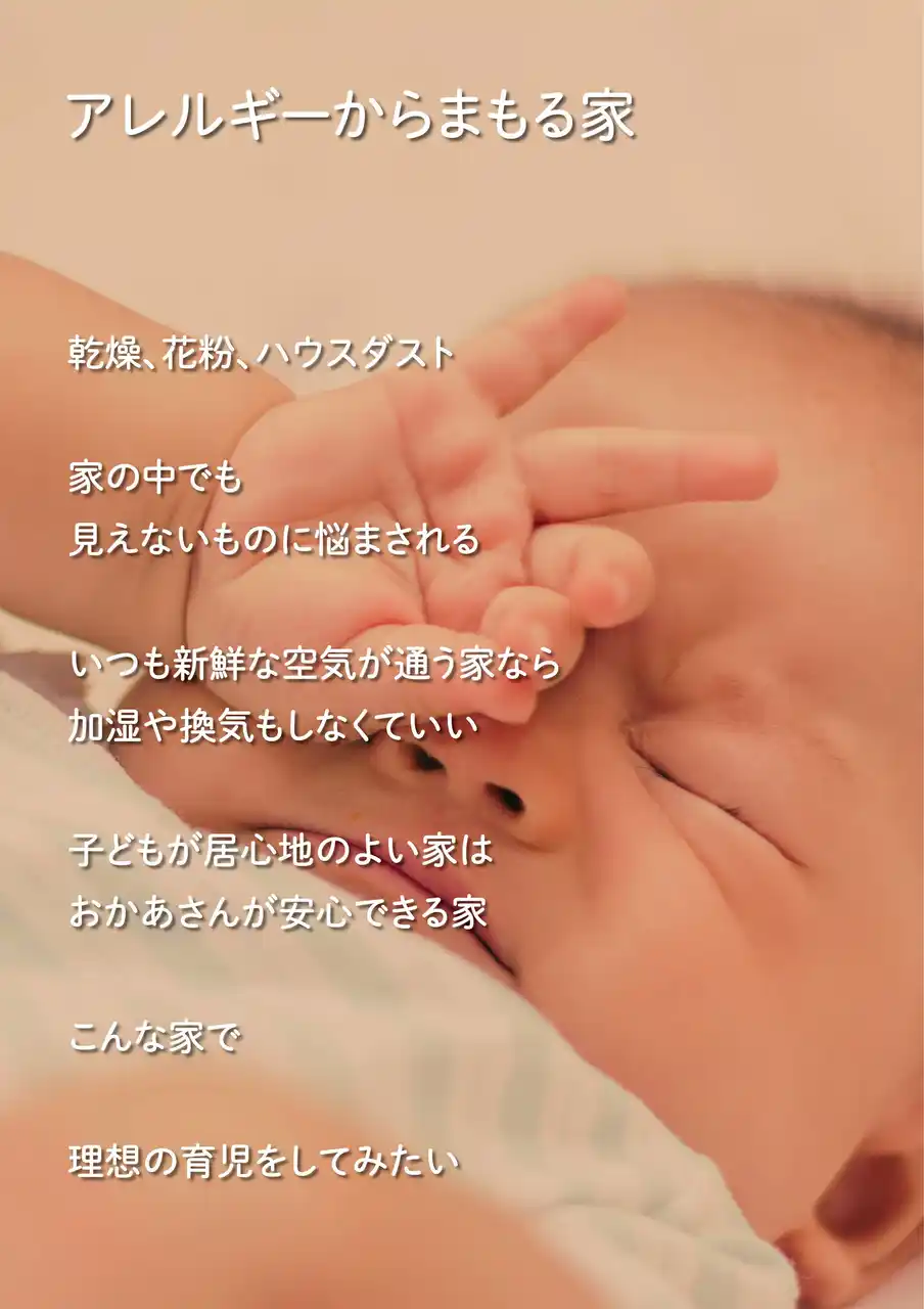花粉や黄砂、夏の熱風や虫を気にして窓を開けられない日でも安心。家全体が常に新鮮な空気に入れ替わるので、ハウスダストやアレルギーから子どもを守ります。