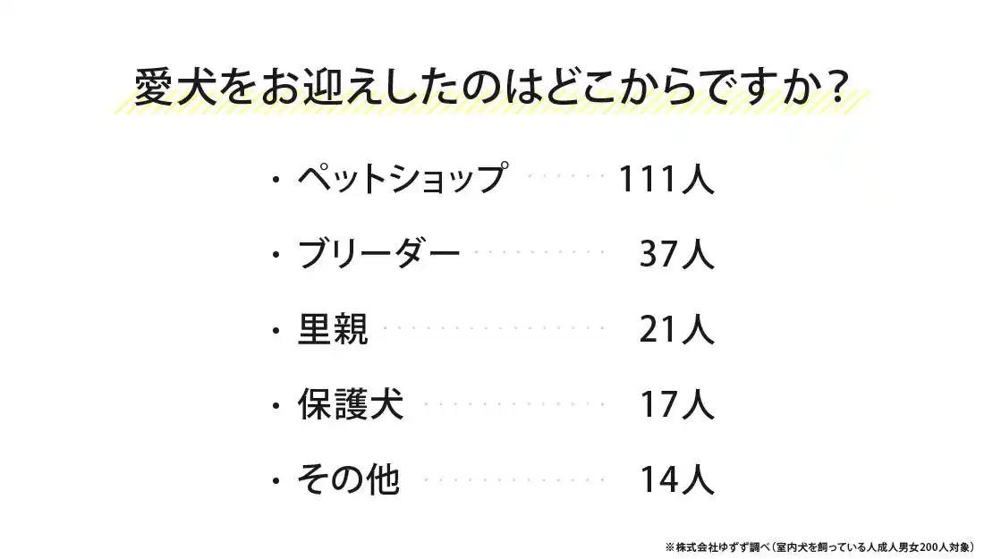室内犬を飼っている飼い主200人に「愛犬をお迎えしたのはどこからですか?」と質問したところ、最も多かったのは「ペットショップ」という結果になりました。 |
