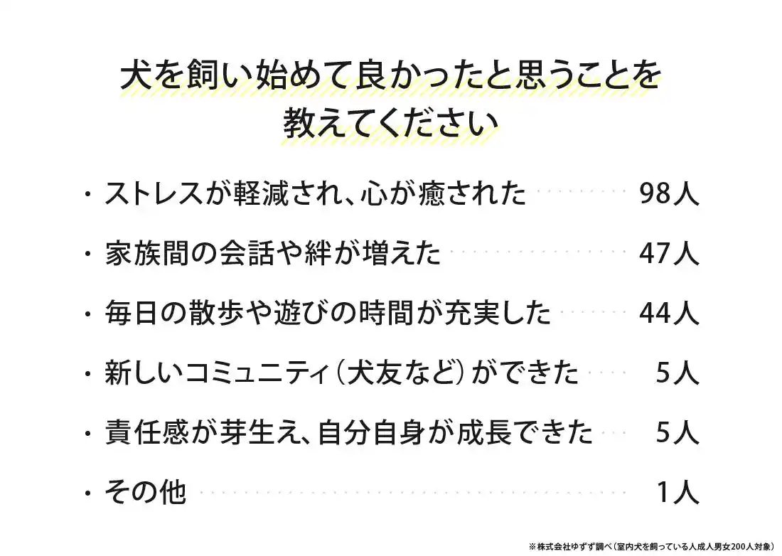 室内犬の飼い主さんたちが感じる「良かったこと」のトップは、「ストレスが軽減され、心が癒された」ことでした。 |