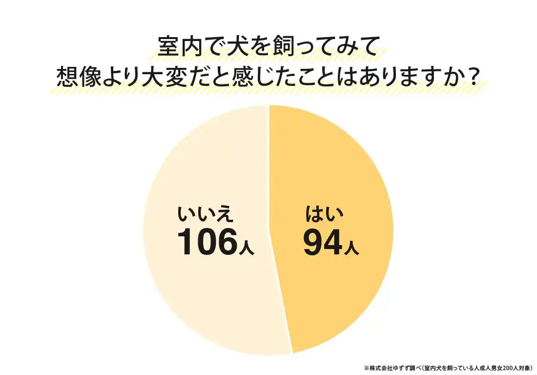 一方で、「室内で犬を飼ってみて想像より大変だと感じたことはありますか?」という質問には、半数近くの94人が「ある」と回答しました。 |