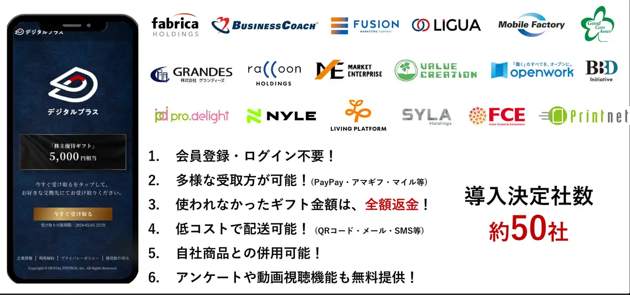 ZETA株式会社(代表取締役社長:山崎 徳之、東証グロース市場:証券コード6031)において、株式会社デジタルプラス(代表取締役社長:菊池 誠晃、本社:東京都渋谷区、東証グロース市場:証券コード3691)の子会社である、株式会社デジタルフィンテック(代表取締役社長:菊池 誠晃、本社:北海道札幌市)が運営する「デジタルギフト(R)」を株主優待としてご活用いただくことになりました。 |