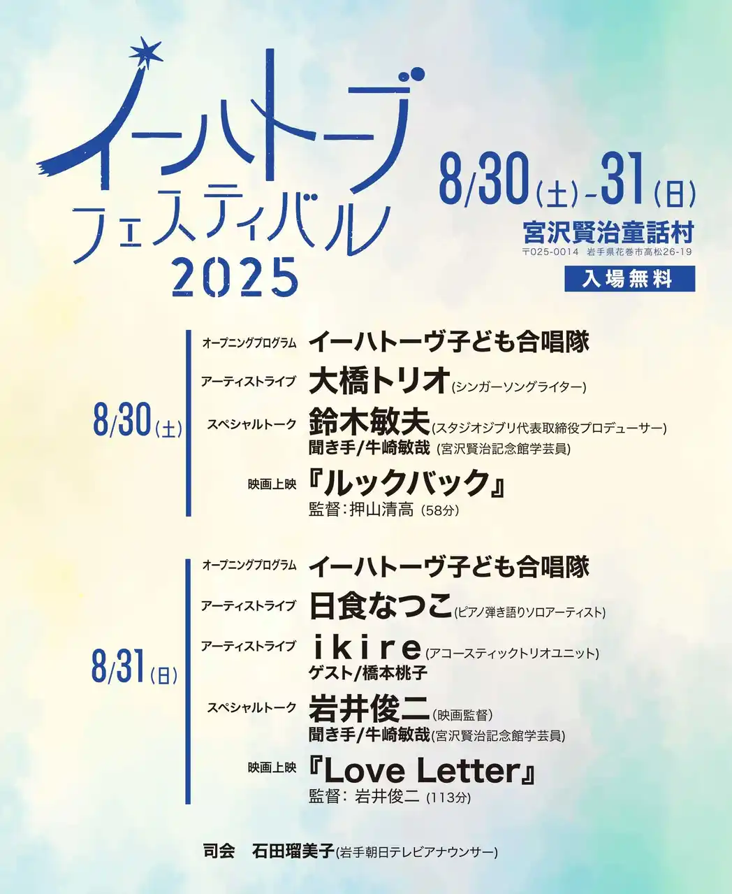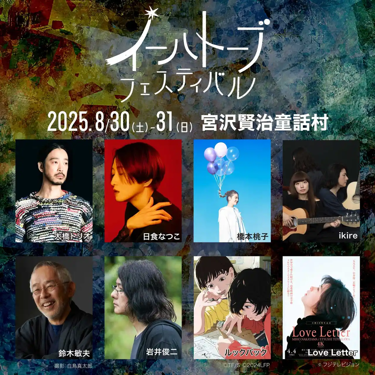 「イーハトーブフェスティバル2025」では、大橋トリオ、日食なつこ、ikireら3組のアーティストによるライブ、鈴木敏夫(株式会社スタジオジブリ代表取締役プロデューサー)、岩井俊二(映画監督)をゲストに招いたスペシャルトークショー、さらに、今年日本アカデミー賞最優秀アニメーション作品賞を受賞した劇場アニメ『ルックバック』(押山清高監督)、世代を超えて世界中で愛され続けている恋愛映画の金字塔『Love Letter』(岩井俊二監督)を特別上映。両日ともオープニングでは、イーハトーヴ子ども合唱隊によるパフォーマンスが披露されます。 |