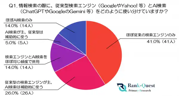 最も多くの回答を得たのは「ほぼ従来の検索エンジンのみを使っている」で全体の41.0%(41人)を占めました。GoogleやYahoo!など、長年にわたって親しまれてきた検索サービスは、使い慣れた操作性や高い信頼性により、依然として多くのユーザーにとって主な情報収集手段として利用されています。